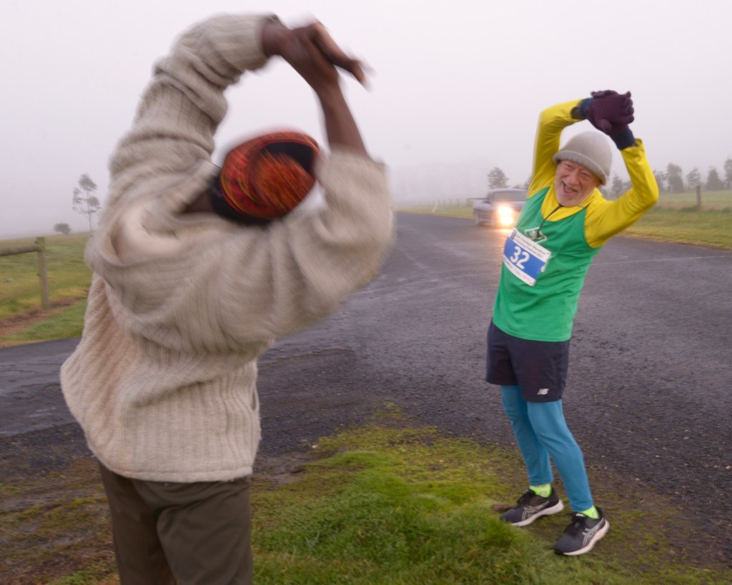 Today events conspire to help me. The good people who organise the event provide a special Early Start for the elderly and the unlikely. The weather forecast is for 1 degree Celsius. The Bureau adds, it will feel like minus1. In the event, the temperature starts at 8.7, rising to a windless 14 degrees at the finish. Gloved and cosy inside my six layers of shirting, I dance up and down skittishly at the Early Start. Phil instructs me to stretch, a religious ritual among runners that has always found me a disrespectful agnostic. Obedient today I do stretch. Colin, a friend of almost lunatic devotion, who has driven three hours through fog to photograph me at this early start, falls about laughing at the sight. He snaps his old marathon comrade actually stretching.