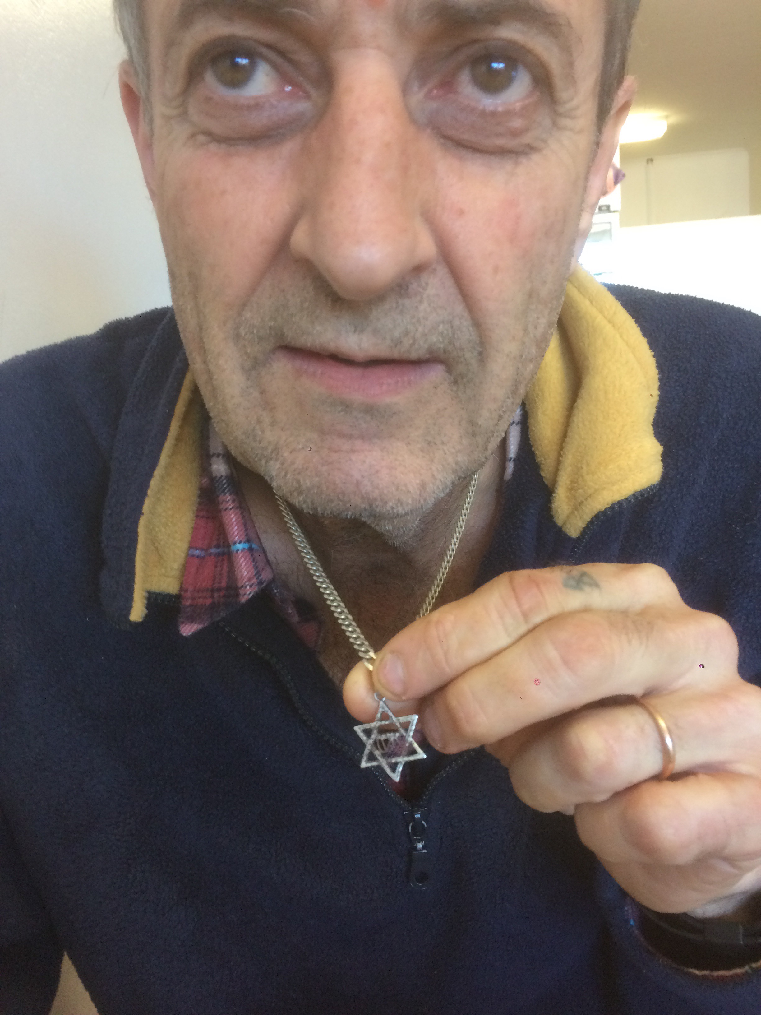 He gropes inside the front of his shirt and pulls out a silver magen david.